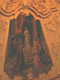 Потолочный плафон разделён на четыре сегмента-медальона, расписанных художником Франсуа Лефлёром. На них изображены сцены из произведений Шекспира «Гамлет», «Сон в летнюю ночь», «Зимняя сказка» и «Как вам это понравится». В центре располагается большая люстра, поражающая обилием и изяществом ажурных деталей. Первый театральный занавес был расписан также Франсуа Лефлёром и изображал сцену из спектакля «Руслан и Людмила».