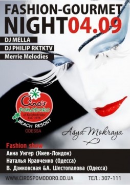 Модный показ сезона осень-зима молодых дизайнеров Украины от арт-лейбла «AsyaMokraya». Главным событием вечера будет презентация новой коллекции от победительницы дубайской недели моды Анны Унгер — кутюрье из Лондона, украинского происхождения. А также дигустационный ужин «Гурмэ», приготовленный Ciro’s Pomodoro специально для этой ночи. Так же в показе примут участие : Наталья Кравченко с коллекцией «pret-a-porter» (Одесса) и Ольга Брюзгина(Одесса) с коллекцией «art-сouture» Музыкальным оформлением вечера выступят : MELLA, Philip Stepanenko (RKTKTV), Merrie Melodies .