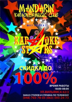 Мандарин — новый музыкальный клуб для всех любителей хороше живой музыки и качественного караоке. Трех-уровневое заведение с большой сценой, отличным звуком, всевозможными спецэфектами. Интерьер не оставит равнодушным никого. Вип-комнаты караоке для отдельных компаний, разнообразное меню, гостеприимный персонал и все что нужно для вашего хорошего настроения. Караоке-live, возможность записи вашего исполнения песни на профессиональном оборудовании и многое другое для всех, кто любит отдыхать в стиле поем и зажигаем до утра. |  | |  |