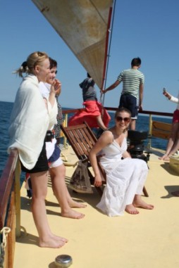 Соки, шампанское, прИзики:), пледики замерзшим, танцы, конкурсы и шикарные фото-кадры! Но с детьми всё же ехать не стала бы: никакой пошлости, просто технически неудобно: качка, борта с отверстиями как раз для ребенка, в открытое море опять-таки с детем не полезешь купаться, а НАДО! |