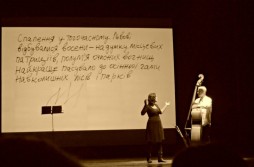 Этот спектакль — игра слов, интонаций, жестов, которые возникают в отчаянном, рискованном и в то же время гармоничном взаимодействии писателя, который проявляется тут не только как автор текстов, но и как певец, и как актер, с прекрасными музыкантами. И неслучайно к рассказу присоединяются именно львовские музыканты — контрабасист Марк Токарь и певица Ульяна Горбачевская. Спектакль дополняет тонкая, ироничная, проникновенная графика Анатолия Белова, которая оживает во время спектакля благодаря работе vj-group «CUBE». Таким образом премьера литературного произведения происходит не в напечатанном виде, а в формате литературно-музыкального перформанса, который предусматривает импровизацию в музыкальных, графических, сценографических и световых решениях.