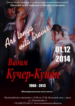 ». Действительно, его картины ошеломительно ярки и реально «живут» в своей сюрреалистической правдивости как цветные сны молодого влюбленного человека. Квинтессенция творческой личности Вадима Кучера-Куцана — удачнейший синтез одесского темпераментного начала (одесская художественная школа им. К. Костанди, мастерская знаменитого одесского художника-педагога Н. Павлюка) и петербургской «строгообразующей» художественной ковки (Академия художеств, мастерская президента Академии Б. С. Угарова). После блестящей защиты дипломной работы в 1996 г. — «Перспектива Невского проспекта» — Вадим возвращается в родную Одессу, но вскорости, подобно прославленным «пенсионерам» Петербургской Академии XIX века, уезжает по приглашению за границу: около года работает в «Доме искусств» города Вильденбурга под Берлином, а затем — жизнь и работа во Франции. Потомок Голиковых — Александр Борич приглашает художника к участию в ежегодных «Русских сезонах» (г. Лион), где картины одесского мастера пользуются неизменным успехом, его холсты изумляют какой-то изысканно-сочной красотой живописной поверхности, необычным сочетанием импрессионистической манеры с неожиданно крепкой, упругой формой. Таким образом, они почти всегда в точности соответствуют философско-творческому кредо, сформулированному Вадимом в своем дневнике: любая линия, пятно, подобны камню, брошенному в пруд. Все это — нарушение покоя, мобилизация пространства, зрение — восприятие действия. Выставка «Ars longa, vita brevis» – мемориальная. Здесь, наряду с характерными, мгновенно узнаваемыми «полноформатными» холстами, очень интересно увидеть камерные, «размышлительные» работы, а также высококлассные графические листы, и здесь — как нельзя кстати – суждение самого мастера: «Победить в себе ремесленничество