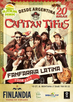 Концерты Capitan Tifus заряжены энергией уникальной комбинации свежей Musica Mestiza, замешанной на ска, роке, балканике и элементах латино в супер-танцевальных замесах, не позволяющих публике усидеть на стульях, где бы они не выступали.