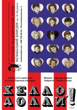 Актёры: Долли – Ольга Оганезова, Тамара Тищенко, Алина Семенова Горас – Станислав Ковалевский, Павел Коломийчук Корнелий – Владимир Кондратьев Барнаби – Владислав Кутуев, Андрей Мирошниченко, Руслан Рудный Ирэн – Аурика Ахметова, Алина Семенова, Ирина Ковальская Мини – Инна Куликова, Наталья Кущенко, Алеся Перекальчук Эрменгарда – Виктория Подольная, Инна Куликова, Наталья Ткачук Эрнестина – Лариса Борисенко, Элла Серебрянская Эмброз – Владислав Кутуев, Руслан Рудный, Денис Фалюта Стенли – Ярослав Донцов Полисмен – Сергей Тищенко Энтони – Евгений Ульяновский, Евгений Косовский мюзикл в 2-х действиях по мотивам Торнтона Уайлдера Музыка — Дж. Херман, либретто — М. Стюарт Джазовая комедийная love story о деловой, стильной, остроумной, неунывающей свахе. Долли с блеском виртуоза соединяет все влюблённые сердца и не забывает устроить и собственное счастье