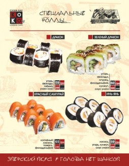 Приглашаем Вас отведать деликатесы Японской кухни! А также в честь открытия очень низкие цены и скидка 10%. Всем кто не равнодушен к японской кухне Всем кто любит встречаться с друзьями и весело проводить время, Всем кто любит большие скидки и отличную еду — ВСЕМ СЮДА!!! Отличная европейская кухня и большое барное меню.Закажи 3 специальных ролла и 4 получи в подарок!!! Японский бизнес ланч всего за 50 грн!!!!!! Мисо суп с тофу + японкий рис + 2 нигири с томаго и напиток на выбор. |