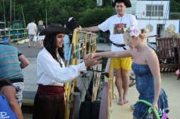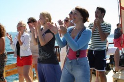 Соки, шампанское, прИзики:), пледики замерзшим, танцы, конкурсы и шикарные фото-кадры! Но с детьми всё же ехать не стала бы: никакой пошлости, просто технически неудобно: качка, борта с отверстиями как раз для ребенка, в открытое море опять-таки с детем не полезешь купаться, а НАДО! |