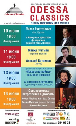 Торжественное открытие Первого Международного фестиваля классической музыки «ODESSA CLASSICS». Паата Бурчуладзе (бас) в сопровождении Камерного оркестра Одесской Филармонии, дирижер Игорь Шаврук. В программе арии Верди, Россини и знаменитые сцены Бориса из оперы Мусоргского «Борис Годунов». Один из лучших оперных певцов мира. Бас. Великий Караян называл Паату Бурчуладзе «Шаляпиным наших дней». Резидент Ла Скала, Метрополитен опера, Ковент Гарден, Музикферайн и Концертхаус (Вена), Немецкая Опера в Берлине, Баварская государственная опера, Штутгартская опера, Ла Моннэ, Опера Бастилия, концертный зал Гаво (Париж), Дворец музыки в Барселоне и др.