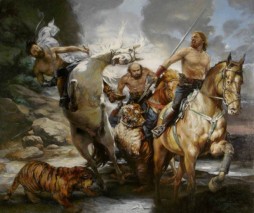 К любимому жанру творчества Сергея Споденюка можно отнести стремительно за-хватывающие и волнующие сцены охоты на львов и тигров. Подобные сюжеты в творчестве Сергея являются своеобразным мастер-классом, где он демонстрирует свое мастерство в построении композиции, точности рисунка, знании анатомического строения людей и животных. Напряженные мышцы тел, стремительно рвущиеся кони, объединены по принципу симметрии. В каждой композиционной группе положение одной из фигур в несколько изменившемся виде повторяет другую. Дух напряженной, яростной схватки передают его картины. Для героев этих произведений охота не праздное развлечение, а отчаянная борьба за жизнь.