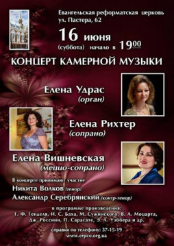 Приглашаем Вас на вечер камерной музыки на Пастера. В концерте принимают участие лауреаты международных конкурсов: Елена Рихтер- сопрано; Елена Вишневская – меццо-сопрано; Елена Удрас-орган, а также Никита Волков- тенор; Александр Серебрянский-контр-тенор. В программе произведения Г. Ф. Генделя, И.С. Баха, Дж. Россини и др Начало концерта 16 июня (суббота) в 19:00 по адресу Пастера, 62. Телефон для справок 37-15-19.