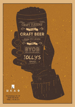 Craft Tuesday with Jolly's Band в Шкафу Always new craft beer varieties! Вторник в Шкафу меняет свой привычный облик под звуки ирландких мотивов и вкус нашего крафтового пива! Веселые и свободные напевы и наша непередаваемая атмосфера гарантируют отлично проведенное время! Начало — 21:00 Вход — свободный
