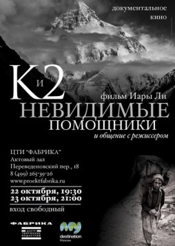 Режиссер и активистка Иара Ли представит свой фильм «K2 и невидимые помощники» в Москве (22-23 октября) и Санкт-Петербурге (24 октября). Вершина K2, расположенная на границе между Пакистаном и Китаем, является второй по высоте горой на Земле. Для многих скалолазов, из-за ограниченного числа маршрутов, более крутого подъема и более трудного последнего отрезка до самой вершины, K2 становится куда большим призом, чем Эверест. Названный «Дикой горой», пик K2 настолько выше окружающей его местности, что он становится незащищенным в открытой атмосфере Земли, тем самым угрожая альпинистам смертельными погодными условиями. В 2008 году трагический случай унес жизни 11 скалолазов.