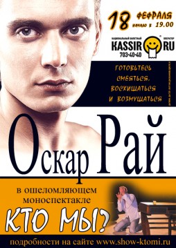 одним словом жизнь в необычном гипнотизирующем исполнении Оскара Рая. Это и искрометный юмор, и щекочущая душу правда, от которой не получится закрыться цинизмом. Готовьтесь увидеть эмоции, разрезающие зрителя пополам. Готовьтесь удивляться и задерживать дыхание. Готовьтесь смеяться, восхищаться и возмущаться… Моноспектакль Оскара Рая «Кто мы?» оставляет неизгладимые впечатления, а текст расходится на крылатые фразы. Трудно представить на «Кто мы?» спящих или задремавших зрителей. Поэтому – идите сами и ведите друзей. Советуйте посетить «Кто мы?» тем, кого любите, тем, кого хотите понять, тем, кто переживает сложности, тем, кто