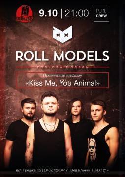 9 октября 2016 года в Одессе команда ROLL MODELS презентует свой второй longplay «Kiss me, you animal» в Шкафу. В начале 2016 года команда выпустила синглы «Girl named fox», «Party animal» и «Japan», которые были радостно приняты публикой, и подогрели интерес к предстоящему альбому. На сентябрь назначена премьера нового клипа команды на одну из заглавных песен. Во время кропотливой работы над альбомом, группа не останавливала свою концертную деятельность. На счету команды совместные концерты с Placebo, Gerard Way (-ex My Chemical Romance) и Zebrahead, а так же камерный акустический концерт в Atlas. 20 сентября состоится релиз альбома «Kiss me, you animal» в сети, для слушателей он будет доступен на платформах ITunes, Google Play, Amazon. Уже сейчас вы можете оценить его preview на официальной страничке ROLL MODELS на SoundCloud. Далее команда отправиться в тур по Украине в поддержку нового longplay, экватором которого станет сольный концерт в клубе SENTRUM, где зрителей ждет большое световое шоу, новое звучание и свежий вкусный альбом, который создан совместно с саундпродюсером Alex Haze (США). Присоединяйся!