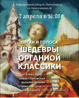 Почему музыка барокко и романтизма в последнее время в тренде? Думается, где-то рядом стоит и растущая популярность литературы нон-фикшн. Мы хотим не только сюжетов, но и скрытых смыслов и неочевидных сверх-идей. В общем, Знания, но поданного живым литературным языком. Всё это есть в творчестве барочных и композиторов романтизма, создающих произведения для органа. Аллегории, таинственные риторические фигуры и легкость, позволяющая воспринимать композиции даже маленьким детям. В аутентичном пространстве Собора прозвучат шедевры органной классики в виртуозном исполнении Елены Удрас (орган), Елены Стаховской (сопрано), Василия Дзисюка (флейта), Станислава Цема (контртенор). Ведущая концерта лектор-музыковед Эльвира Паламарчук.