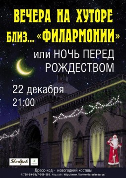Вечера на хуторе близ… «Филармонии» или Ночь перед Рождеством Празднично украшенное фойе филармонии ожидает наших любимых слушателей классической музыки. И как каждый год в июне, а в этом году и в декабре, администрация филармонии подготовила увлекательный вечер для своих зрителей «Вечера на хуторе близ… «Филармонии» или Ночь перед Рождеством» Впервые на нашем вечере объявлен дресс-код – новогодний костюм. Это может быть деталь новогоднего костюма или весь костюм. 21.30 – Большой Зал филармонии. На сцене симфонический оркестр под управлением Заслуженного артиста Украины Игоря Шаврука. Прозвучат музыкальные иллюстрации Г.В. Свиридова к повести А. С. Пушкина «Метель» в исполнении оркестра и чтецов Сергея Сеславинского и Елены Шаврук. 22.30 – 23.30 Приглашаем всех гостей в фойе. Традиционные рождественские гуляния вместе с ансамблем народной песни «Славяне» 22.30 – Камерный зал. Рождественский театр «Вертеп» Звучит мужской хор Иверского монастыря. 23.30 Большой зал филармонии. Праздничный новогодний концерт. И МНОГО СЮРПРИЗОВ!!!!! Весь вечер гостей ждут угощения и напитки от ресторана «Шерлок», и торговых марок «АSKANIA» и « GREENDAY».