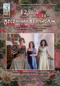 Приглашаем 12 июня (суббота) в Пресвитерианскую церковь на Пастера62 На вокально — органный концерт «Весенний вернисаж» В концерте принимают участие: лауреаты международных конкурсов : Елена Удрас (орган), Елена Рихтер(сопрано),Елена Вишневская (меццо-сопрано), Герман Киселёв(флейта). Прозвучат произведения : И.С. Баха, А.Вивальди, С.Франка, Т.Любуа, П.Флетчера и др. Концерт ведёт Юлианна Панченко Начало концерта 12 июня в 18.30(суббота) по адресу Пастера,62. Телефон для справок +380949457086; (048)789-10-86 www.erpco.org.ua